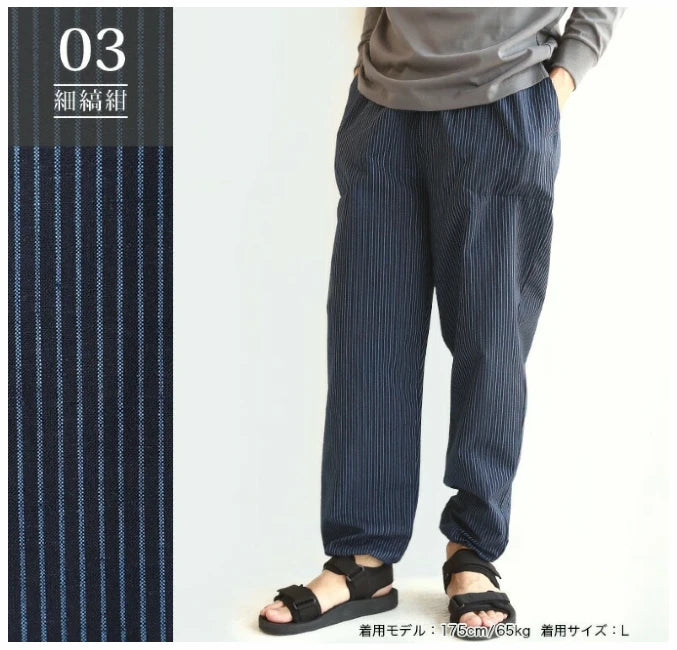 These monpe casual pants are hand-crafted in Japan by Watanosato. With an elasticated waistband and a drawstring, they can easily be adjusted to fit comfortably. Made with 100% Kurumeori cotton.