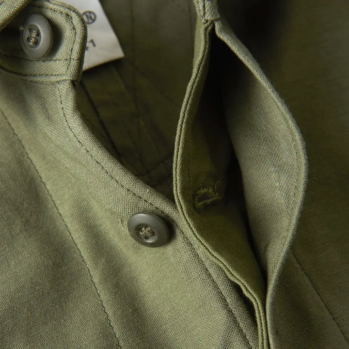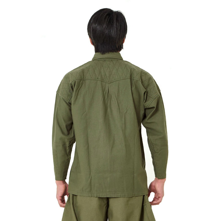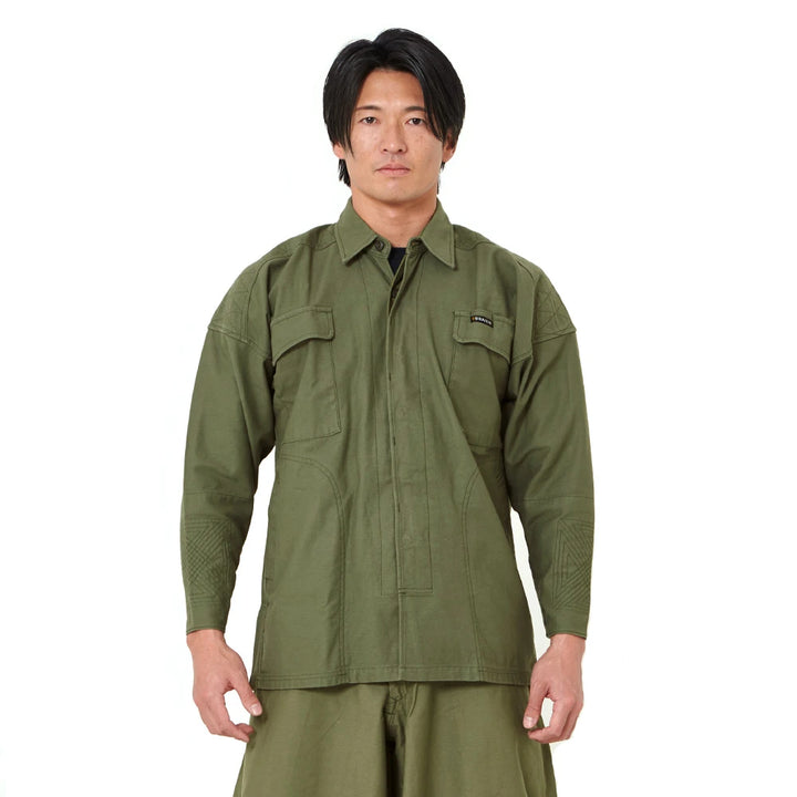 This is a classic "tobi" shirt as worn by construction workers across Japan. The shoulders and forearms have reinforced stitching, and the sleeves are secured with 6 kohaze tabs. The front buttons are concealed and the chest pocket flap has a hidden loop button and a pen holder. The 4441 Series is made with 100% cotton for strength, softness and comfort.