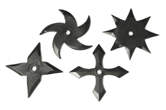 Set of 4 very realistic imitation throwing stars (shuriken) for Halloween or to use anytime with our other ninja gear. Made of rubber, completely safe for children.
