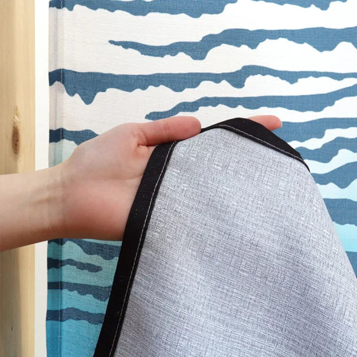 This Japanese door/partition curtain is based on one of the best-known images from Japan: the majestic Mt. Fuji lit up in bright red by the setting sun. This is an ukiyoe by Hokusai, Japan’s most famous woodblock artist.