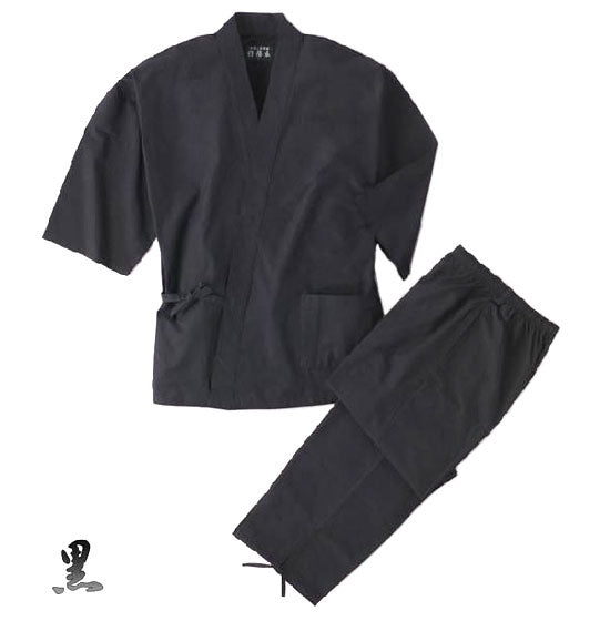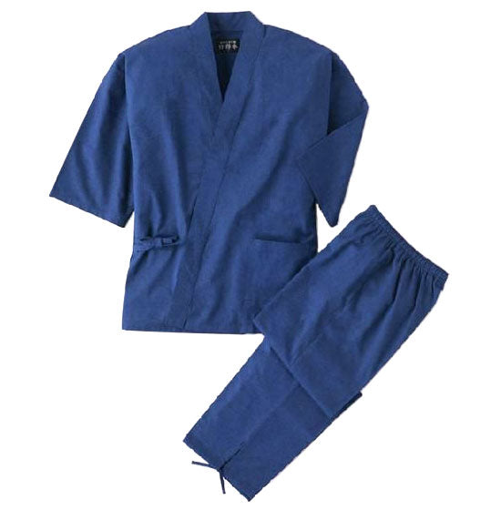 Samue, loose-fitting cotton kimono-style top and trouser sets, are top-quality traditional Japanese casual and leisure wear. This model is made in the city of Kurume, renowned for its high-quality fabrics and clothes. Unlike cheaper brands that are made overseas and post-dyed, this samue is woven from the best hand-dyed cotton.