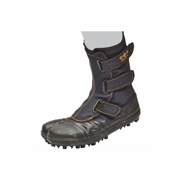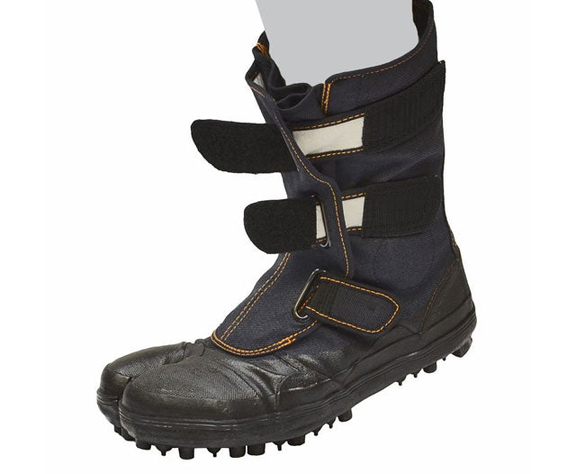 Soukaido make very sturdy work boots. This jikatabi type has reinforced steel toe protection; rubber-coated metal "spikes" on the sole; protective padding for the ankles; nylon-reinforced cotton canvas uppers; partly water-proofed; three velcro fasteners for convenience and a perfect fit; a tough but flexible sole, webbed at the toe to prevent debris from getting caught.