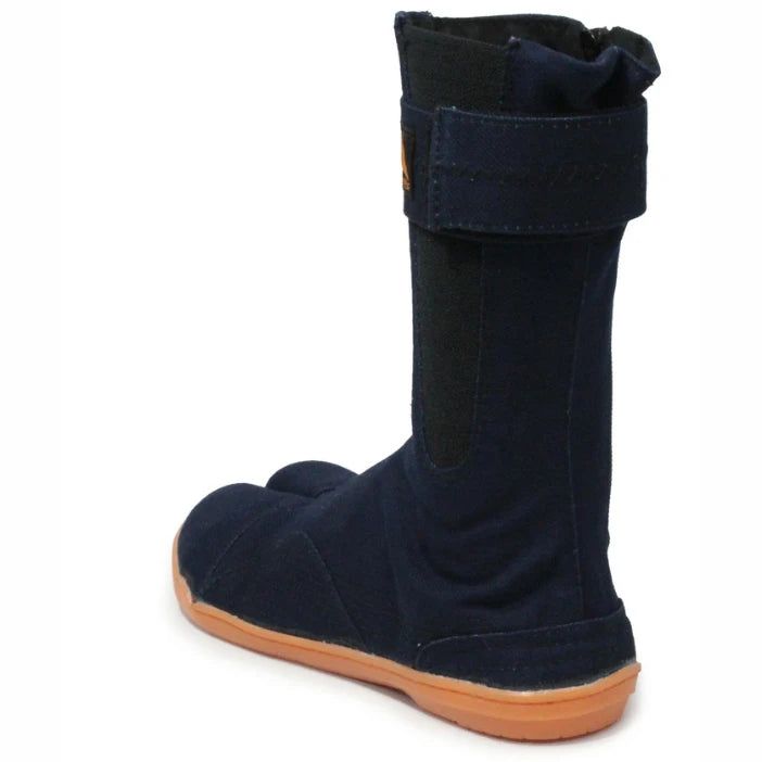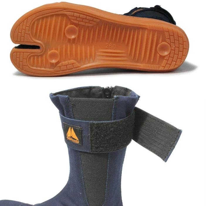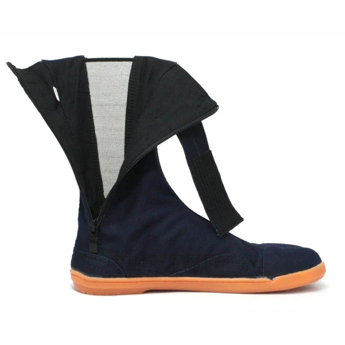 Indigo Blue version of Soukaido's popular work boots. This jikatabi has a tough but flexible rubber sole with suction/grip pads; a zip fastener for convenience and a velcro fastener across the calf for a perfect fit; a shock absorbing insole; and a lightweight, high-strength resin toe cap for solid protection.