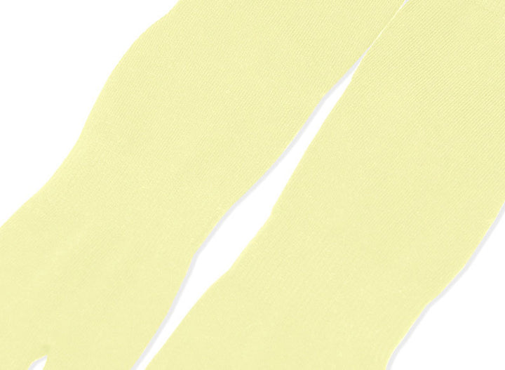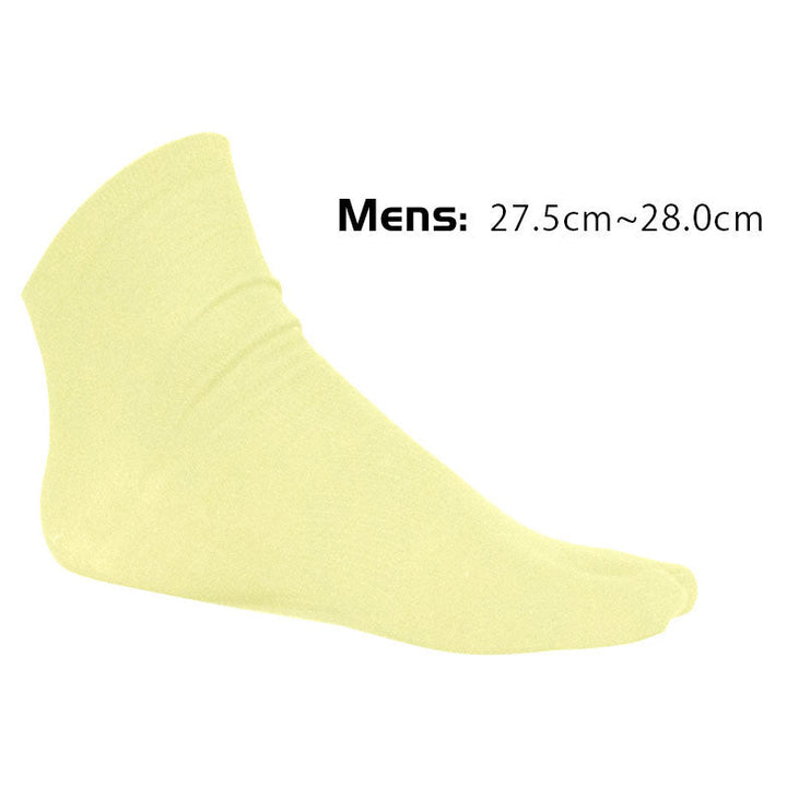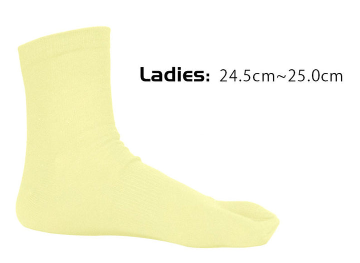 These lightweight yellow tabi socks have no fitted heel so they can fit a wide range of shoe sizes. The images just show how they would look worn by people with different shoe sizes.