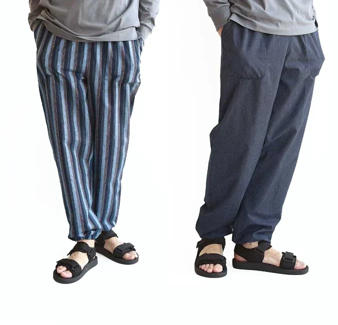 These monpe casual pants are hand-crafted in Japan by Watanosato. With an elasticated waistband and a drawstring, they can easily be adjusted to fit comfortably. Made with 100% Kurumeori cotton.