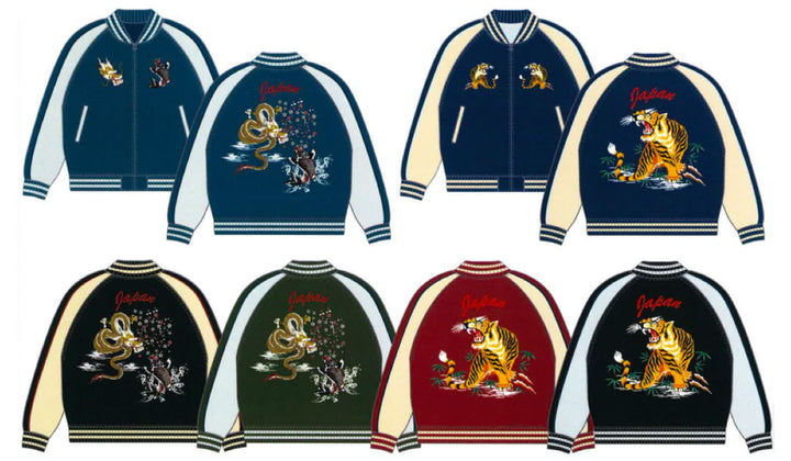 Diese stilvollen Satin-Bomberjacken, auch Souvenirjacken genannt, zeigen klassische japanische Bilder wie Drachen, Tiger und den Berg Fuji. Es gibt sie in einer Vielzahl von Farbkombinationen, darunter auch das coole All-Black.
