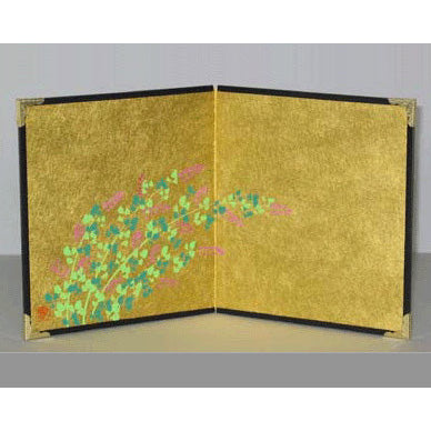 Design : Auf einem traditionellen Hintergrund aus Blattgold präsentiert dieser beliebte Paravent Hagi oder Buschklee. Die Grün- und Rosatöne der Pflanze kommen in diesem Byobu zum Leben.