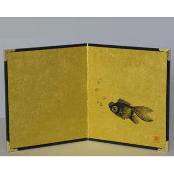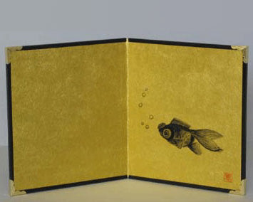 Design : Auf einem traditionellen Hintergrund aus Blattgold zeigt dieser beliebte Paravent einen Kingyo oder Goldfisch. Von den Details der Blasen bis zum ironischen Ausdruck in den Augen der Fische ist dies ein subtiles und exquisites Stück.