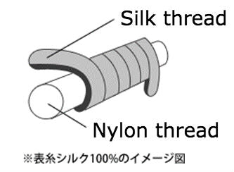 Da Seide als Material nicht besonders dehnbar ist, bestehen diese Socken aus einem Nylonfaden, der mit Seide umgeben ist (siehe Bild). Das einzige Material, das mit Ihrer Haut in Kontakt kommt, ist Seide.