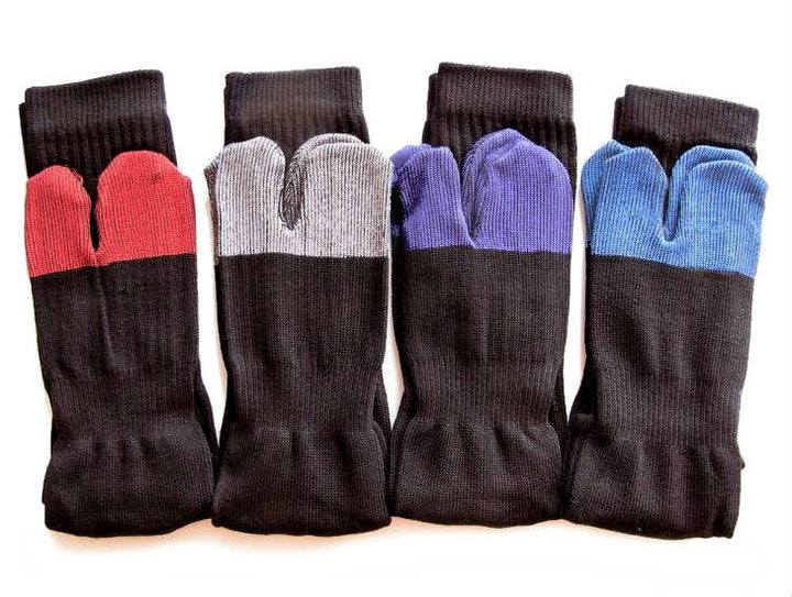 Diese Socken haben einen Schlitz für den großen Zeh, so dass sie einfach und bequem mit verschiedenen japanischen Schuhen getragen werden können. Der Trennung des großen Zehs werden gesundheitliche Vorteile zugeschrieben, da das Beugen des großen Zehs sowohl entspannt als auch das Gehirn stimuliert.