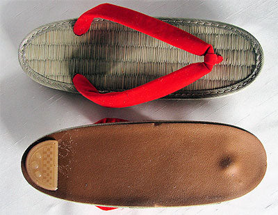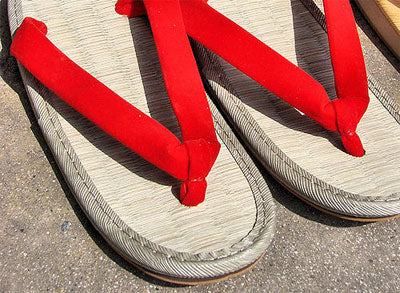 Diese handgefertigten Zori-Sandalen sind von bester Kyoto-Qualität. Hergestellt aus gewebtem Stroh im Tatami-Stil in zwei Bahnen mit roten Samtriemen und Gummisohlen.