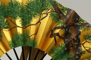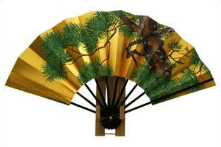 Dieser Fächer ist umkehrbar, hat aber auf beiden Seiten das gleiche Design – eine unvergängliche blaue Kiefer vor einem auffälligen goldenen Hintergrund.