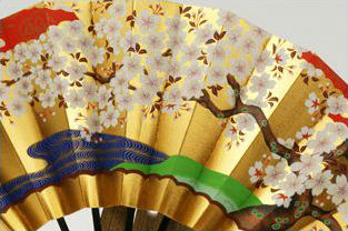 Dieser Fächer ist wendbar, mit Kirschblüten an einem Flussufer vor einem goldenen Hintergrund auf der einen Seite und Ahornblättern vor einem silbernen Hintergrund auf der anderen Seite.