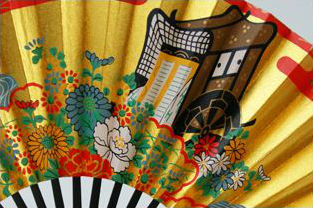 Dieser Fächer ist wendbar, mit einer kaiserlichen Kutsche und Blumen auf der einen Seite und einem einfachen Blütenmotiv auf der anderen Seite.