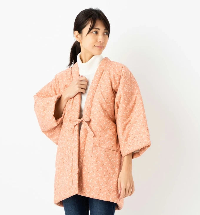 Hanten sind traditionelle japanische Mäntel oder Jacken mit einer einfachen Krawattenschlaufe vorne. Dieser aus hochwertiger wattierter Baumwolle handgefertigte kurze Schlupfmantel im Kimono-Stil eignet sich hervorragend als warmer Outdoor-Mantel für Picknicks, Sportveranstaltungen oder den Garten.