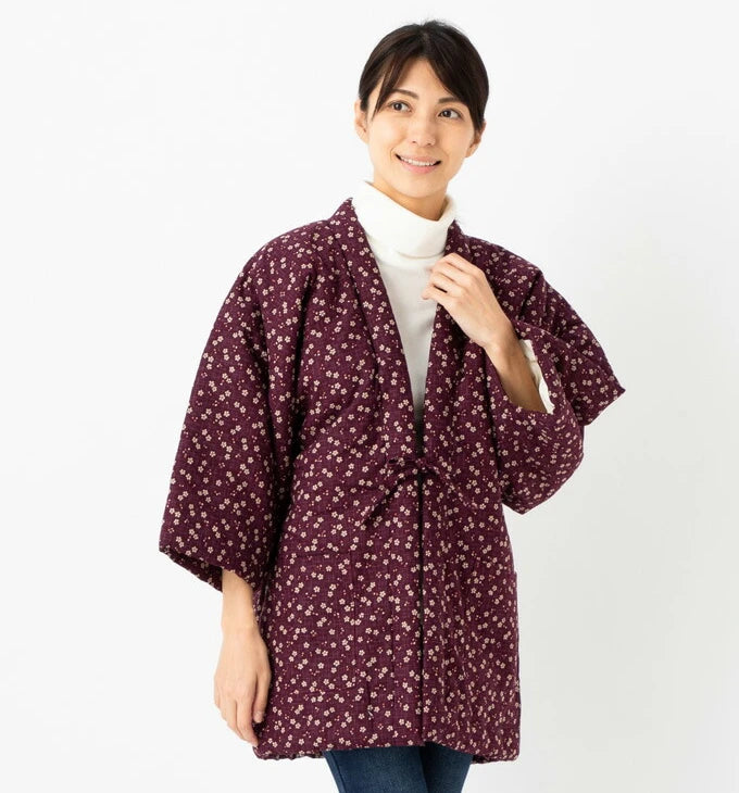 Hanten sind traditionelle japanische Mäntel oder Jacken mit einer einfachen Krawattenschlaufe vorne. Dieser aus hochwertiger wattierter Baumwolle handgefertigte kurze Schlupfmantel im Kimono-Stil eignet sich hervorragend als warmer Outdoor-Mantel für Picknicks, Sportveranstaltungen oder den Garten.