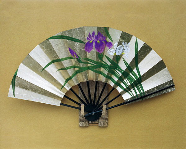 Dieser große Fächer wird in Kyoto von dem renommierten Künstler Tomokazu Kurashima handbemalt und handgefertigt. Es ist auf beiden Seiten mit eindrucksvollen natürlichen Bildern bemalt, die den Wechsel der Jahreszeiten widerspiegeln. Dieser Fächer trägt auf der einen Seite das Design einer Aprikosenblüte, auf der anderen Seite eine Iris. Mit mehreren im Wesentlichen japanischen Elementen ist dieser Fächer im wahrsten Sinne des Wortes ein Klassiker.