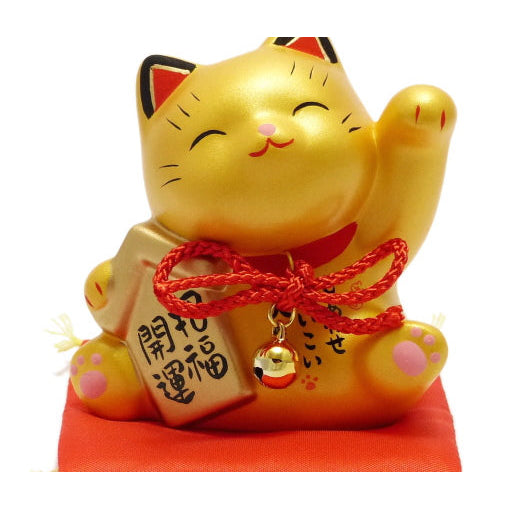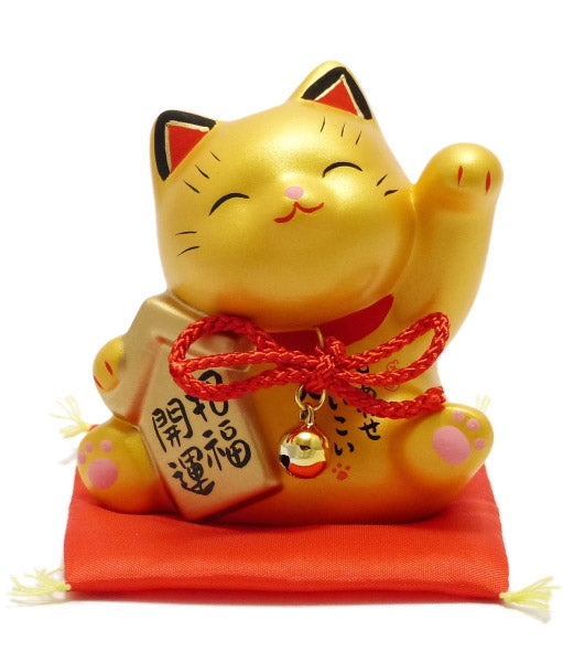Die Maneki Neko (winkende Katze) ist ein sehr beliebtes Glückssymbol und wird normalerweise am Eingang eines Hauses oder Geschäfts platziert. Die erhobene linke Hand lockt neue Menschen (Kunden, Freunde, Liebhaber) in Ihr Leben, während die goldene Farbe Reichtum symbolisiert.