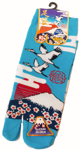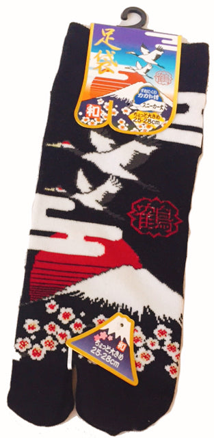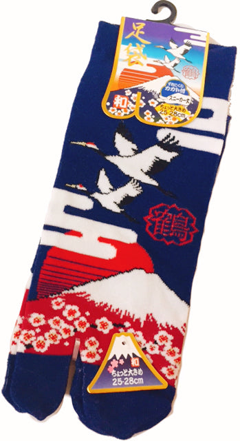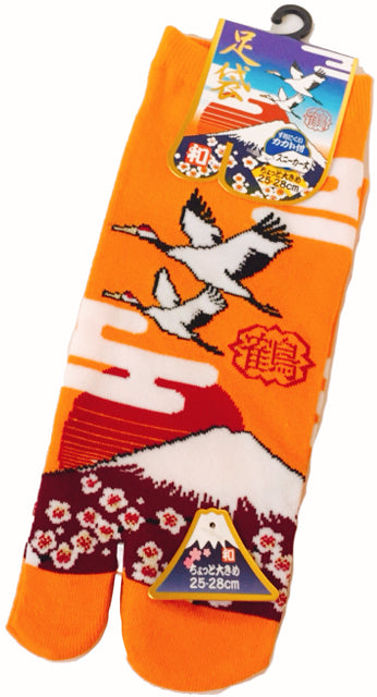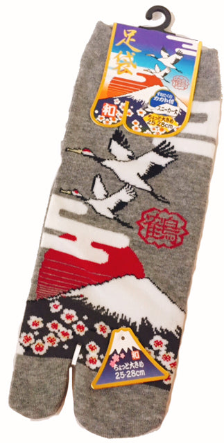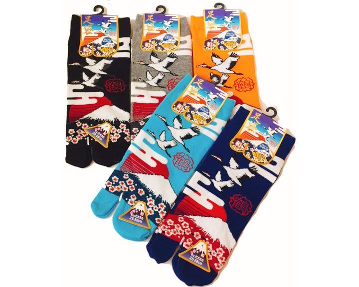 Diese wunderschönen Tabi-Sneakersocken zeigen den Kranich, den anmutigen Vogel, der eines der berühmtesten Symbole Japans ist und über dem Berg Fuji fliegt. Es gibt sie in fünf Farben.