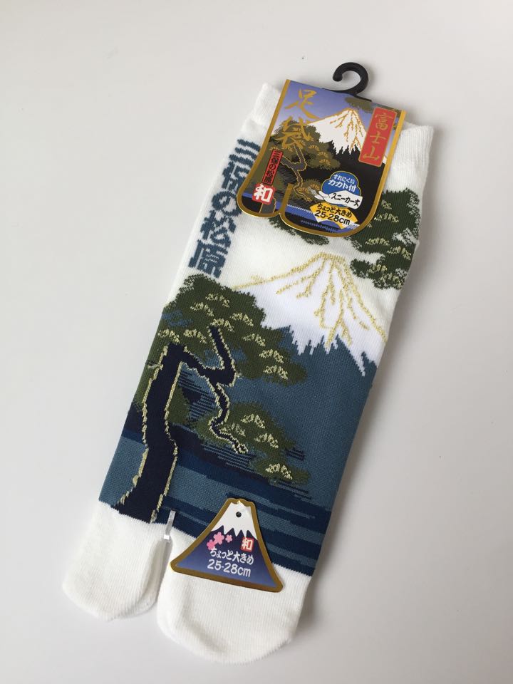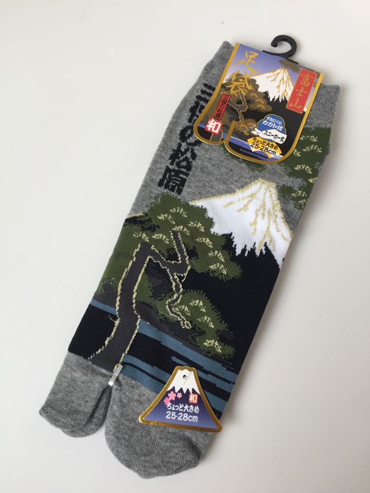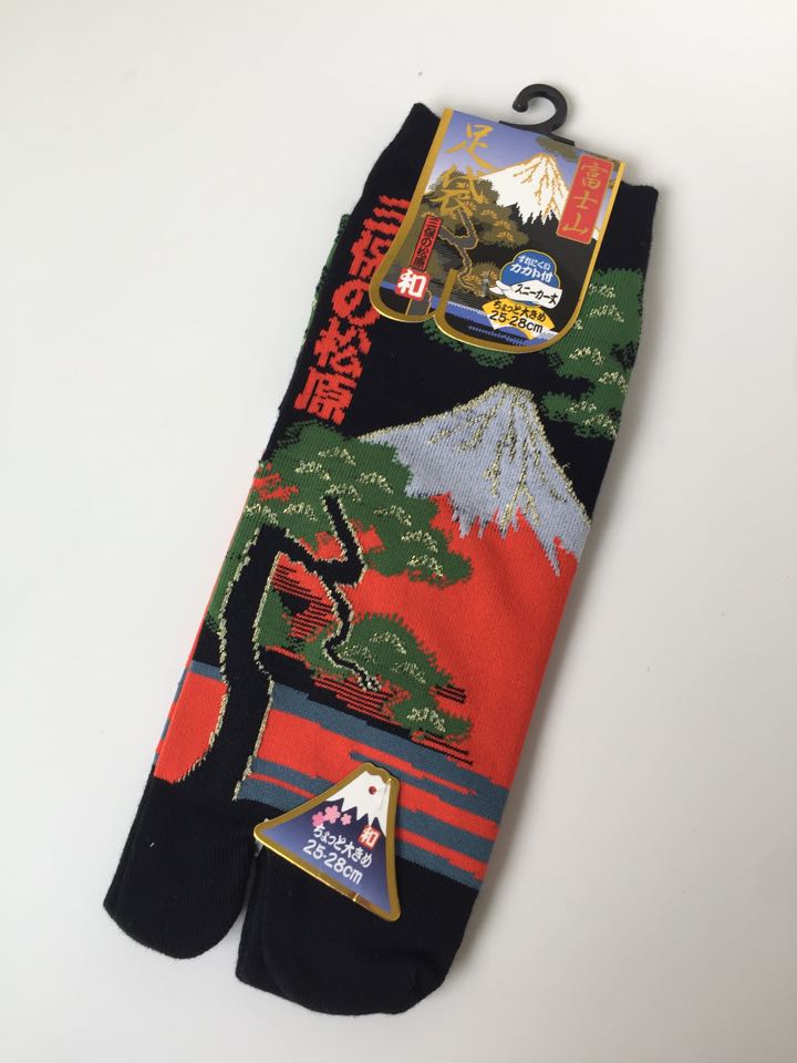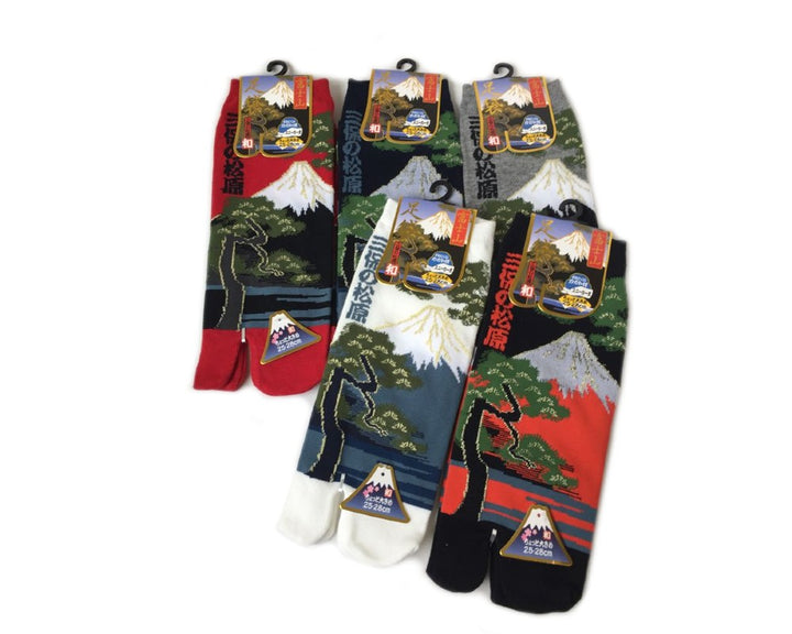 Diese wunderschönen Tabi-Sneakersocken bieten einen Blick auf den Berg Fuji, eines der berühmtesten und bekanntesten Symbole Japans, aus der Sicht vom malerischen Kiefernhain Miho-no-Matsubara, einem 7 km langen Küstenabschnitt mit 54.000 Kiefern. Es gibt sie in fünf Farben.