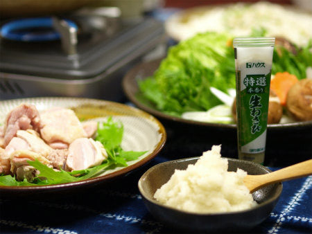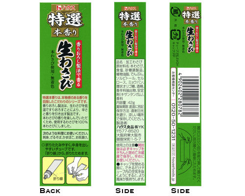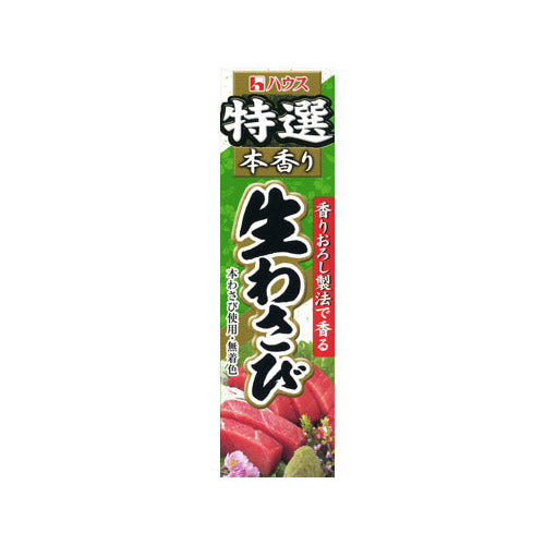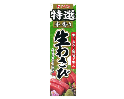 Pâte Tokusen Nama Wasabi de House Foods. Tokusen signifie « haute qualité » et cette pâte de wasabi ajoutera non seulement du piquant mais aussi de la classe à n'importe quel plat. Fabriqué à partir de wasabi fraîchement râpé. Ne contient aucun colorant artificiel.