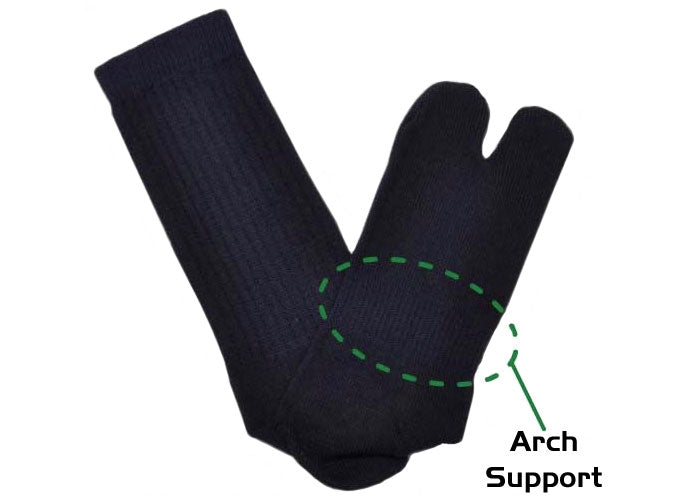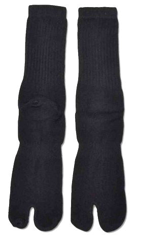 Ces chaussettes tabi noires de taille robuste sont idéales pour toutes les situations et essentielles à porter avec des jikatabi japonais ou des sandales. 100 % coton avec soutien supplémentaire pour la voûte plantaire et les mollets. Hauteur mi-mollet.