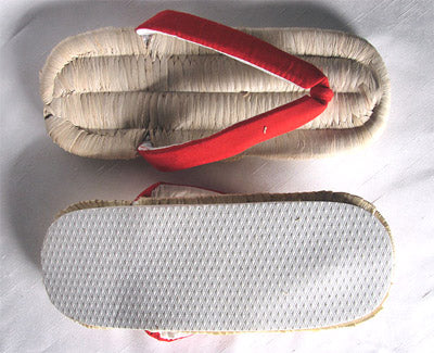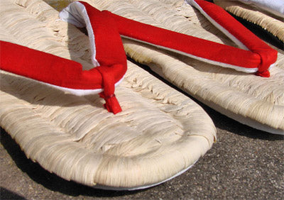 Ces sandales zori faites à la main sont de la meilleure qualité Kyoto. Fabriquées en paille tressée de style rustique en deux panneaux avec des lanières en velours rouge et des semelles en caoutchouc.