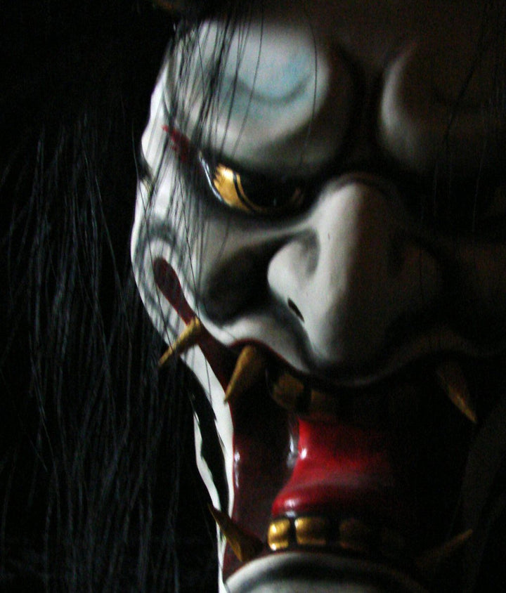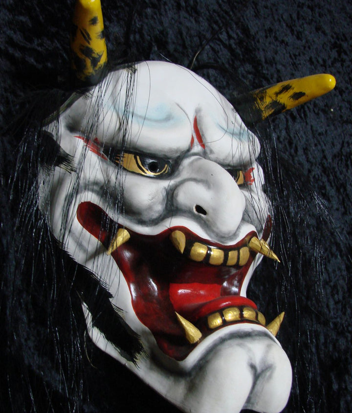 Ces magnifiques masques sont minutieusement fabriqués à la main par des artisans japonais pendant plusieurs semaines et avec des dizaines d'étapes. La base est composée de 9 couches de washi, superposées avec plusieurs couches de kofun (coquillage broyé), diverses encres traditionnelles, pigments et vernis. Les dents sont sculptées à la main dans du bois. Les cheveux sont tantôt synthétiques, tantôt chevalins, tantôt humains.