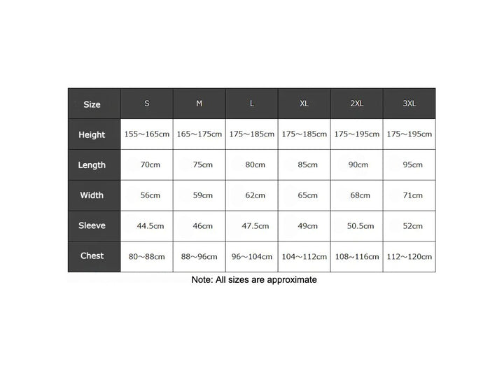 3L: Length = 95cm; Chest 112-120cm; to fit height = 175-195cm (5'9" - 6'5")