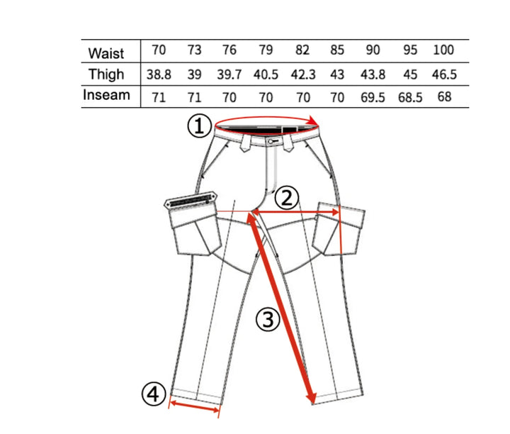 Sizes: Waist = 73cm - 105cm (5 sizes). Inseam = 100 - 102cm.