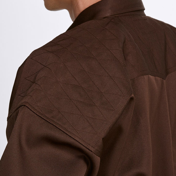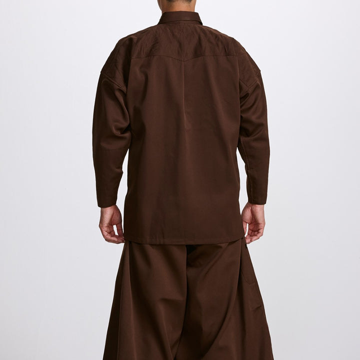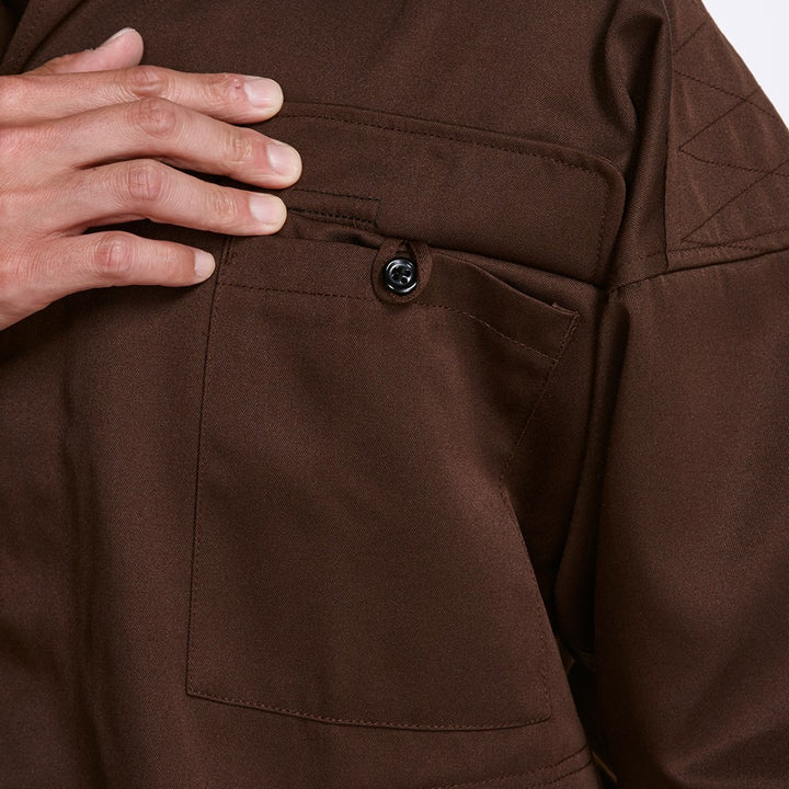 This is a classic "tobi" shirt as worn by construction workers across Japan. The shoulders have reinforced stitching. The chest pocket flap has a hidden loop button and a pen holder.